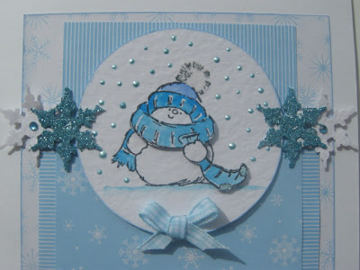 Stamp ~ Penny Black Holly-Jolly which I stamped using Versafine ink and coloured using watercolours. I also layered up the snowman's scarf and added white glitter to the bobble on his hat.